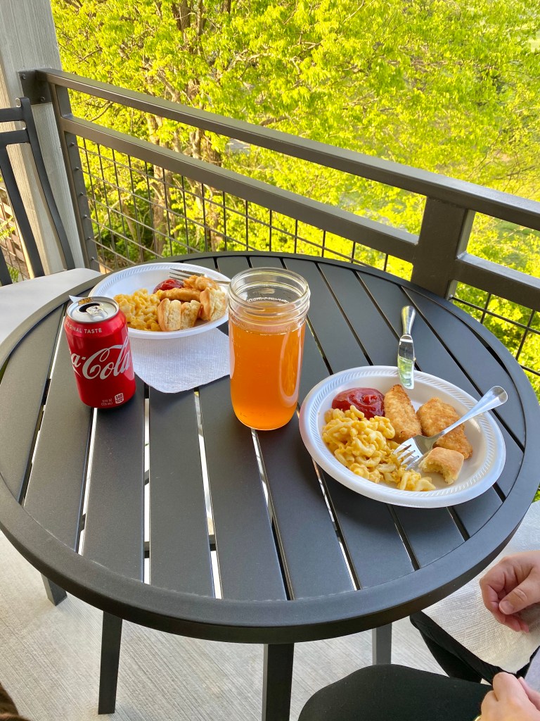 When Ashlynn finished her meeting, we ate dinner outside again with fried chicken, Brussels sprouts (not pictured), mac n cheese, and rolls. We know—yesterday wasn’t the healthiest eating day, but it was special nonetheless.