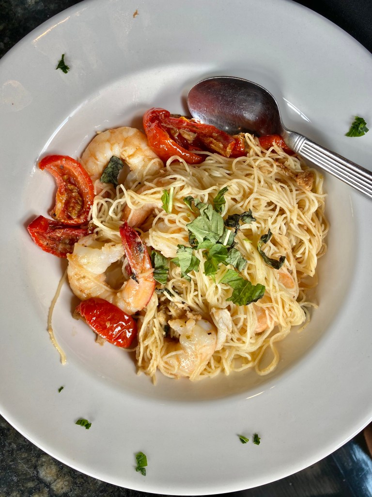 I got the gulf shrimp and crab pasta with roasted tomatoes and basil in a lemon butter sauce. Ashlynn had the Bolognese. Both were incredible!